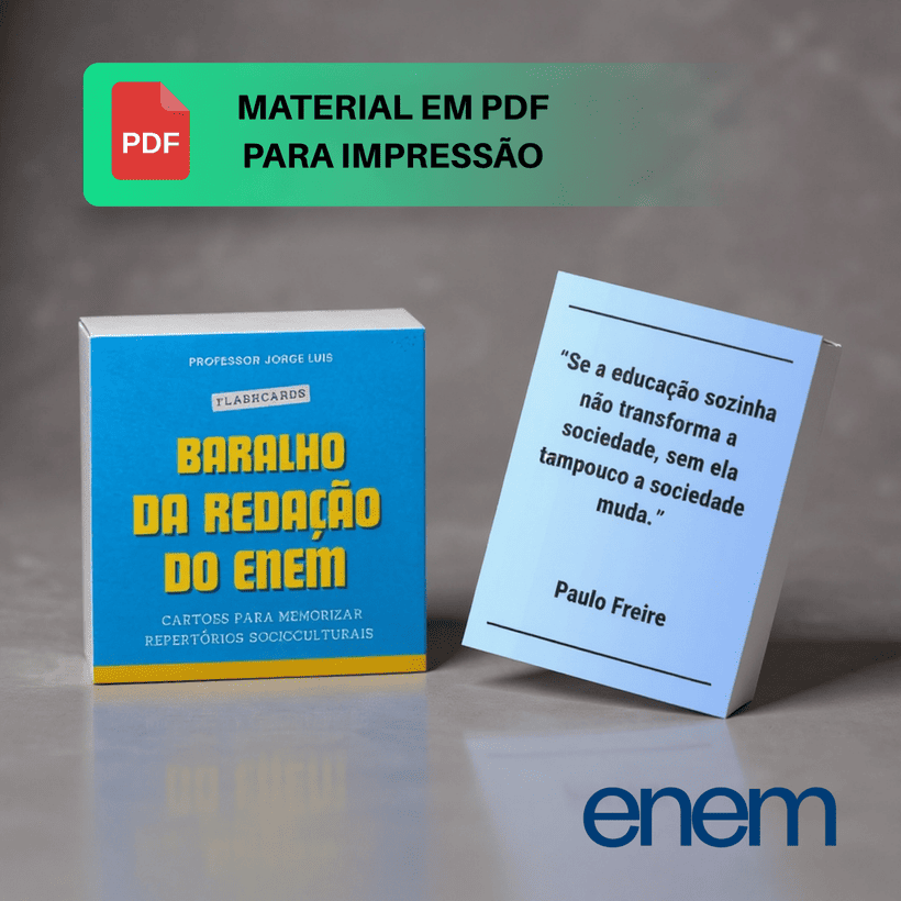 ✅️ 100 cartas (flashcards) em PDF para impressão, que apresentam repertórios socioculturais de diversas áreas do conhecimento, com o objetivo de facilitar a memorização;